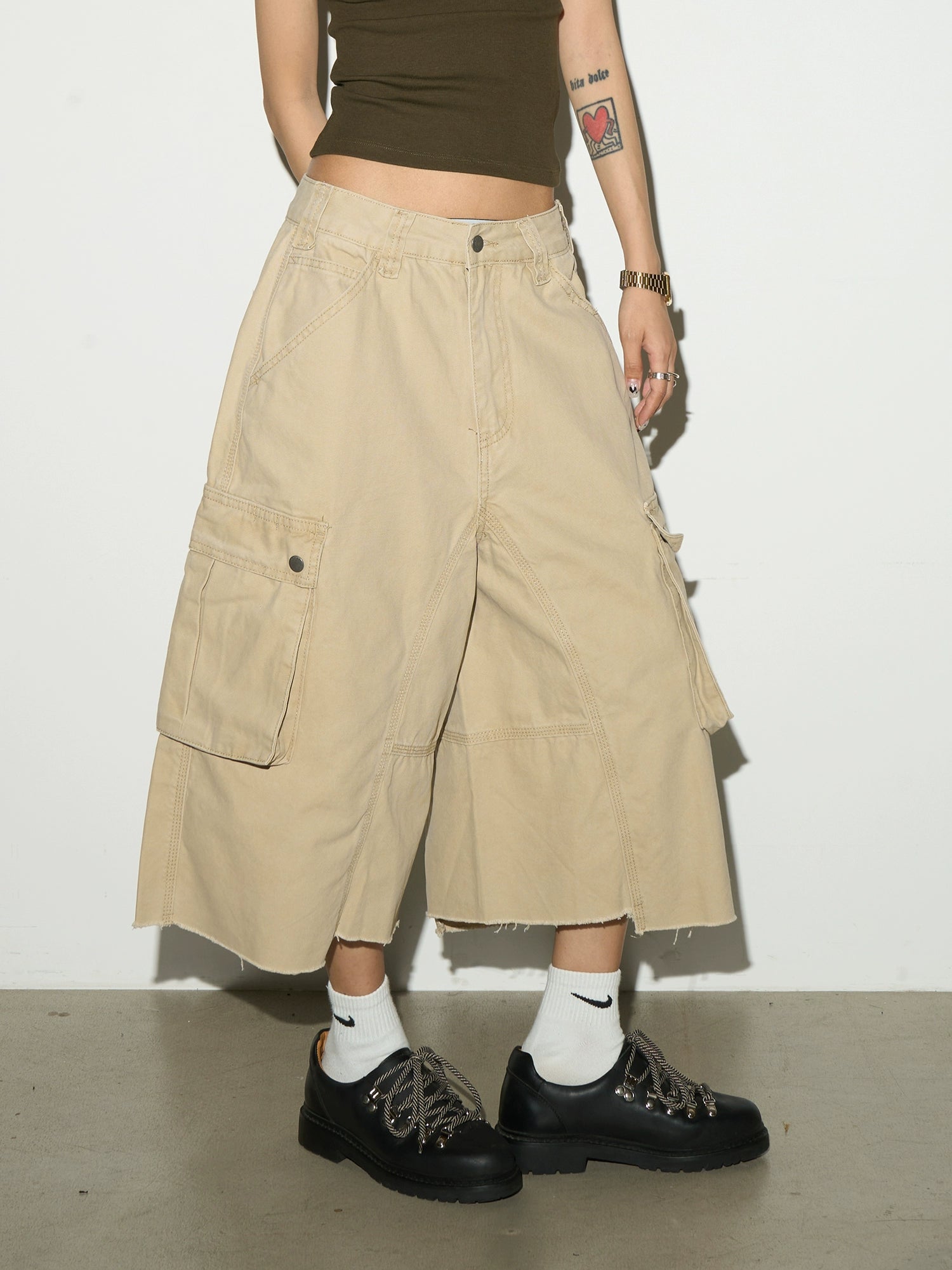 両サイドには存在感のある大型カーゴポケットを配置し、実用性とデザイン性を両立。