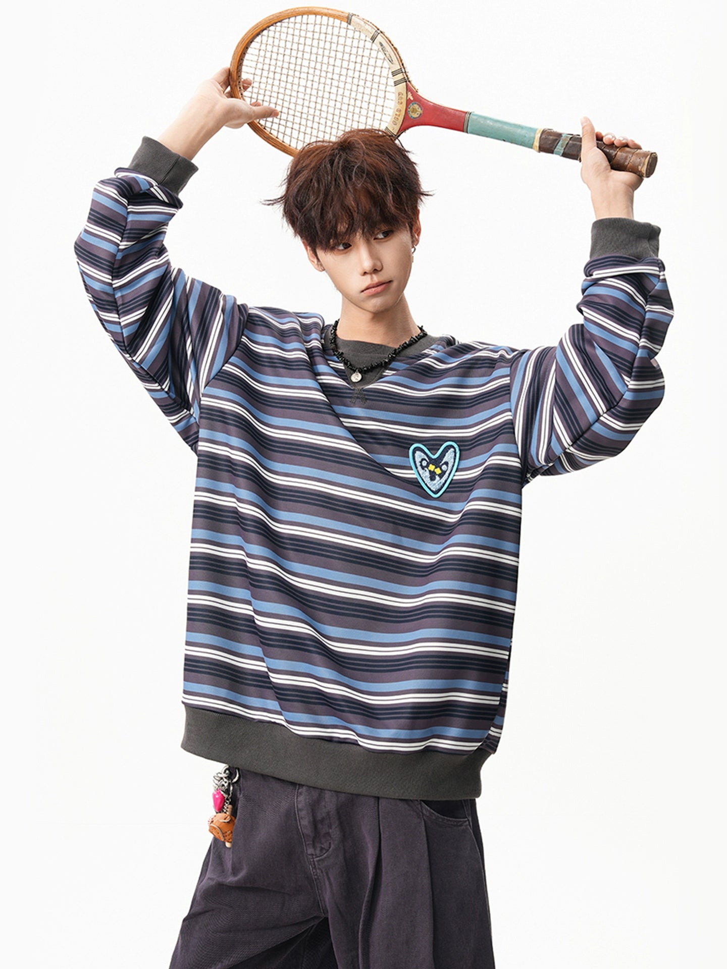 柔らかい配色のストライプ柄に、胸元のハートワッペンをあしらった