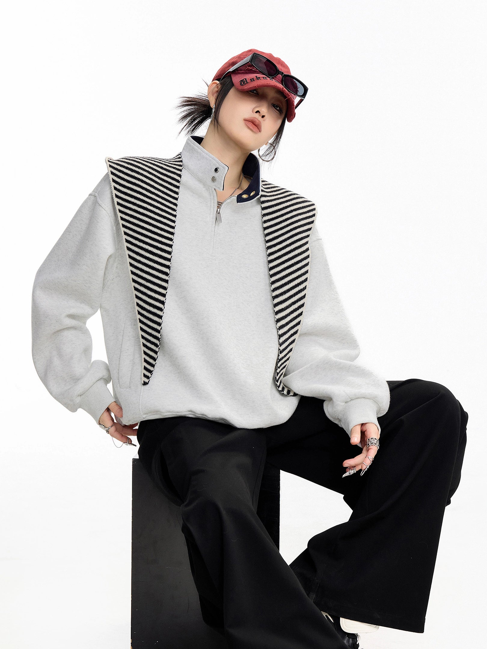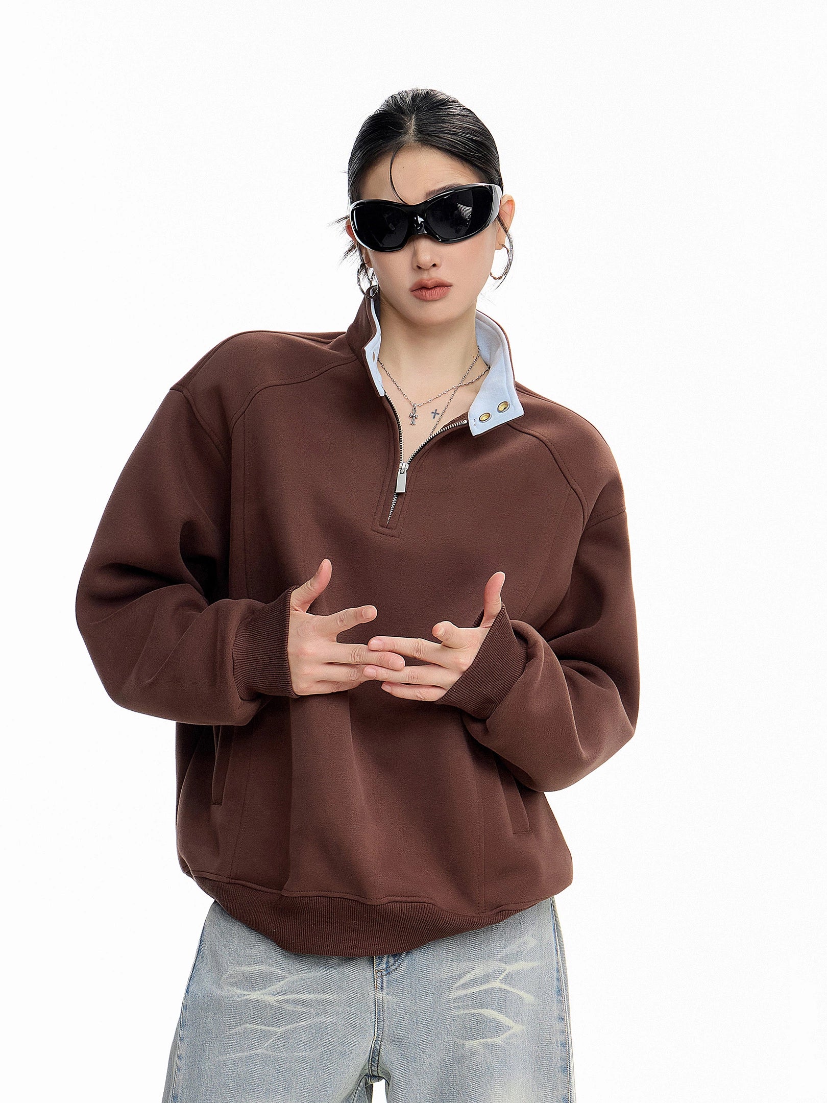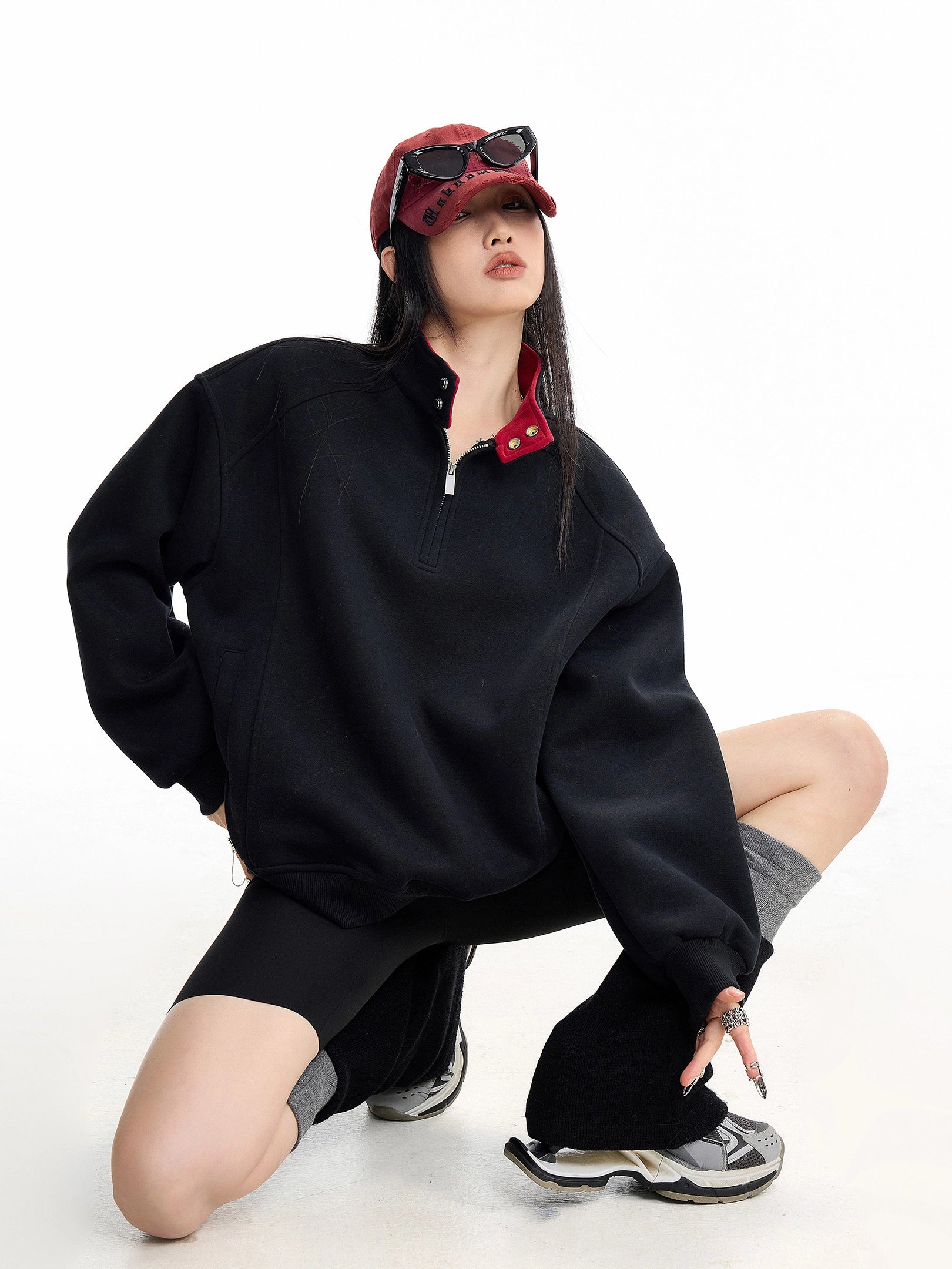 ビッグシルエット × コントラストカラーの襟デザインが魅力のハーフジップスウェット。