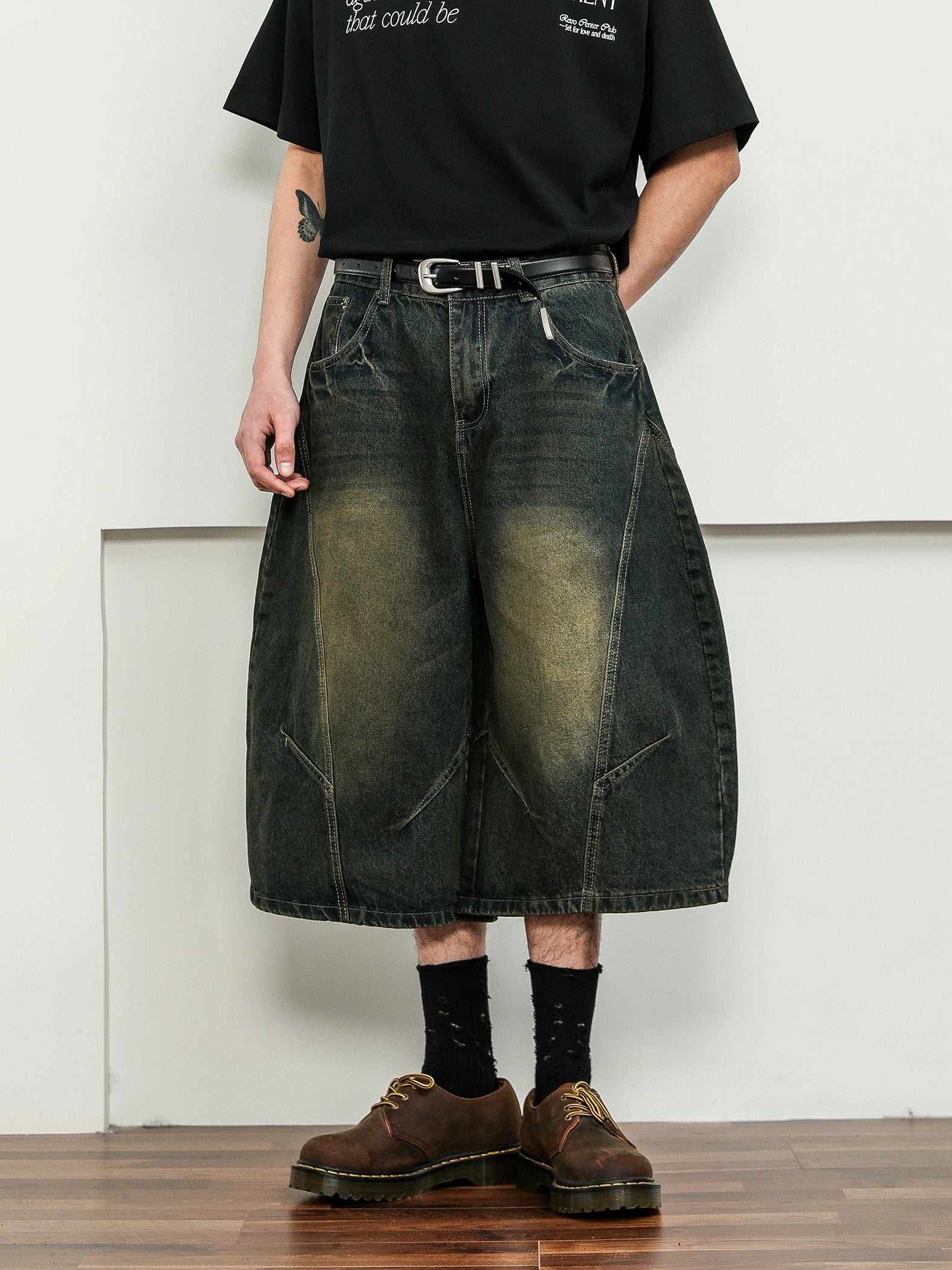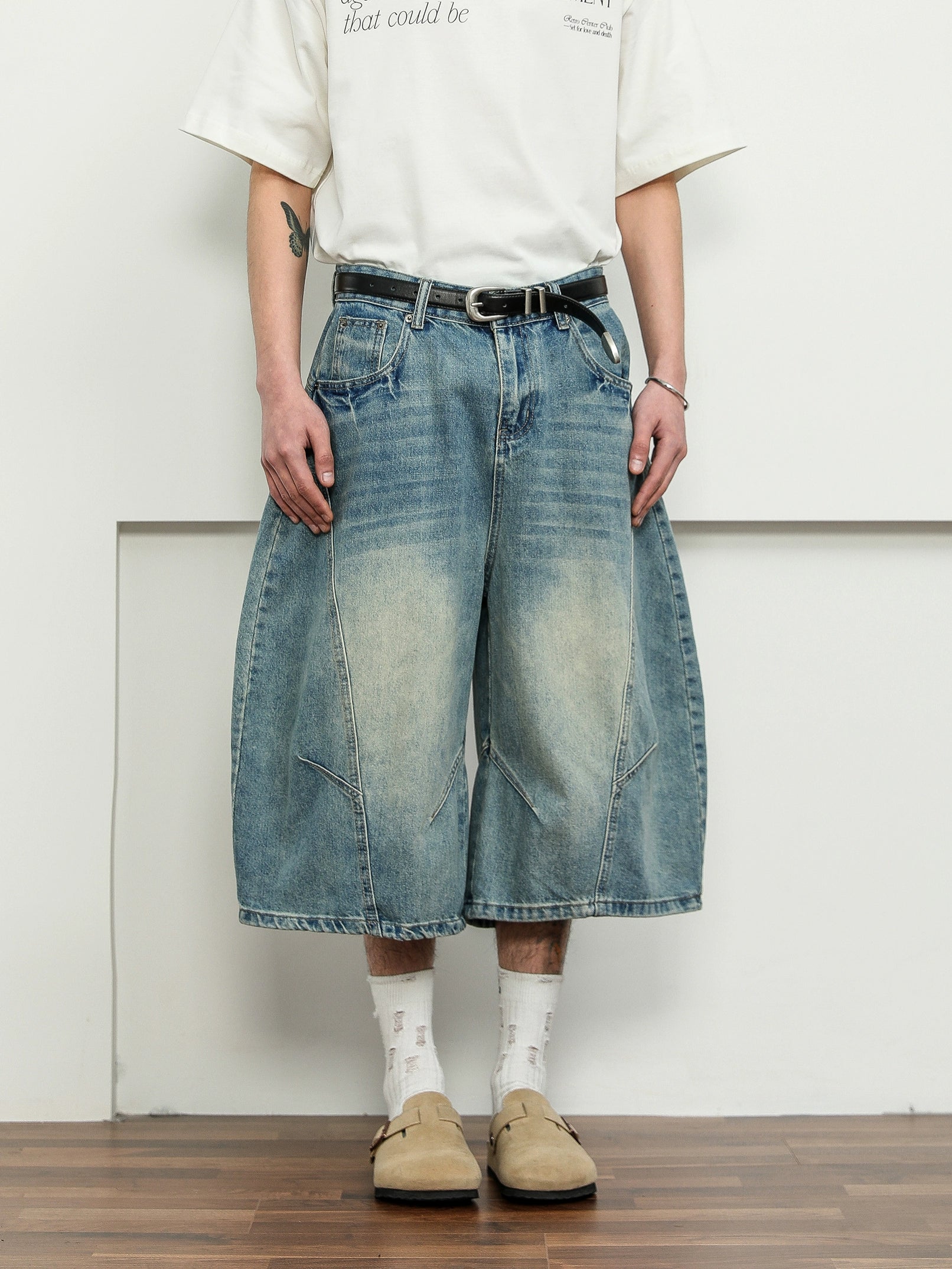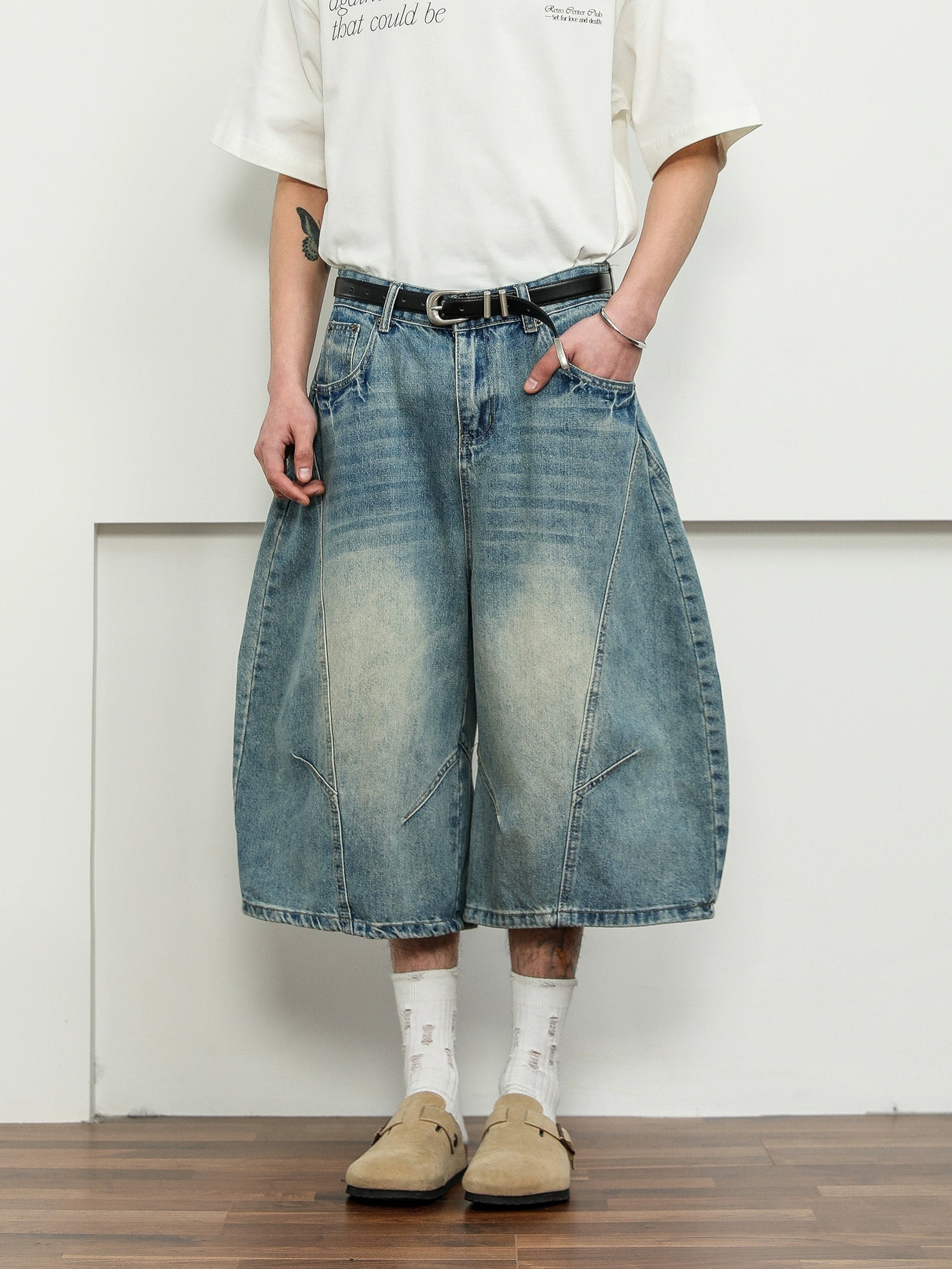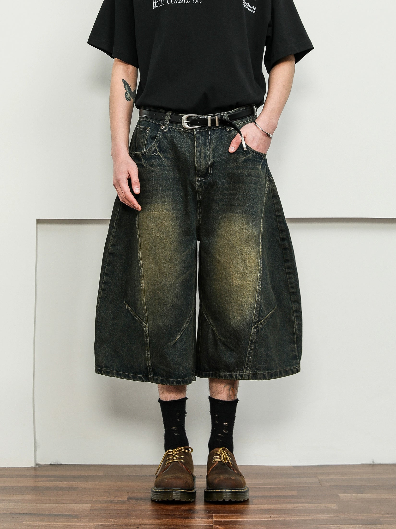 立体的なパターンと絶妙なウォッシュ加工で仕上げた、バルーンシルエットのデニムショーツ。