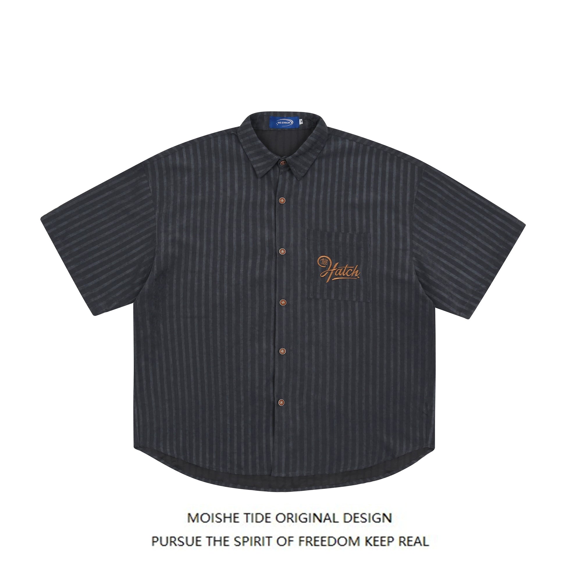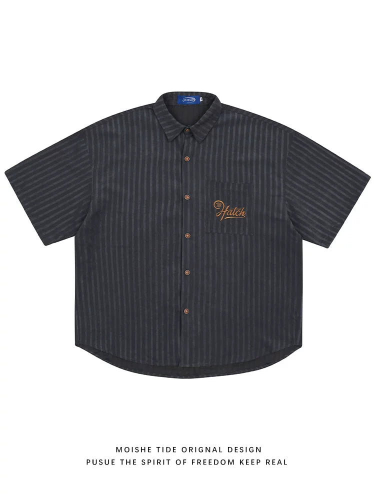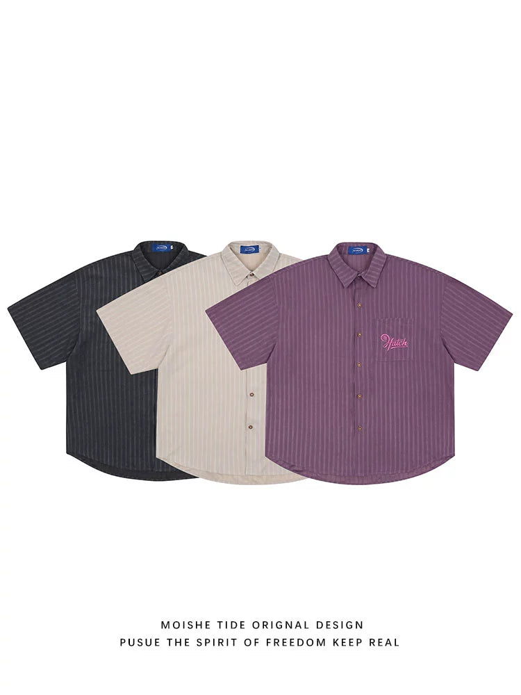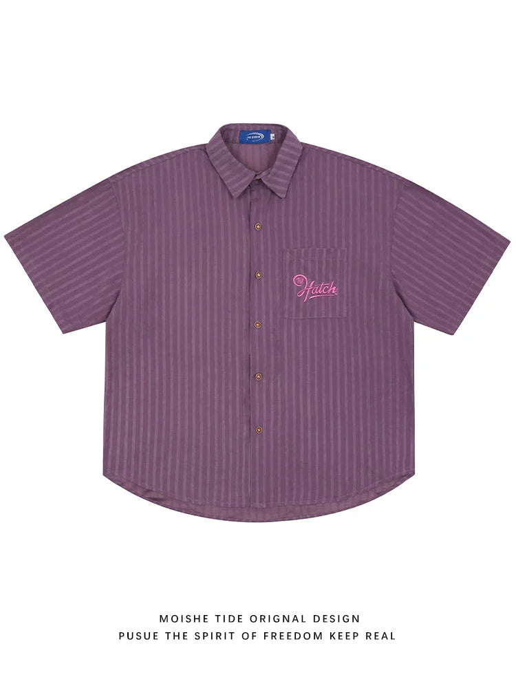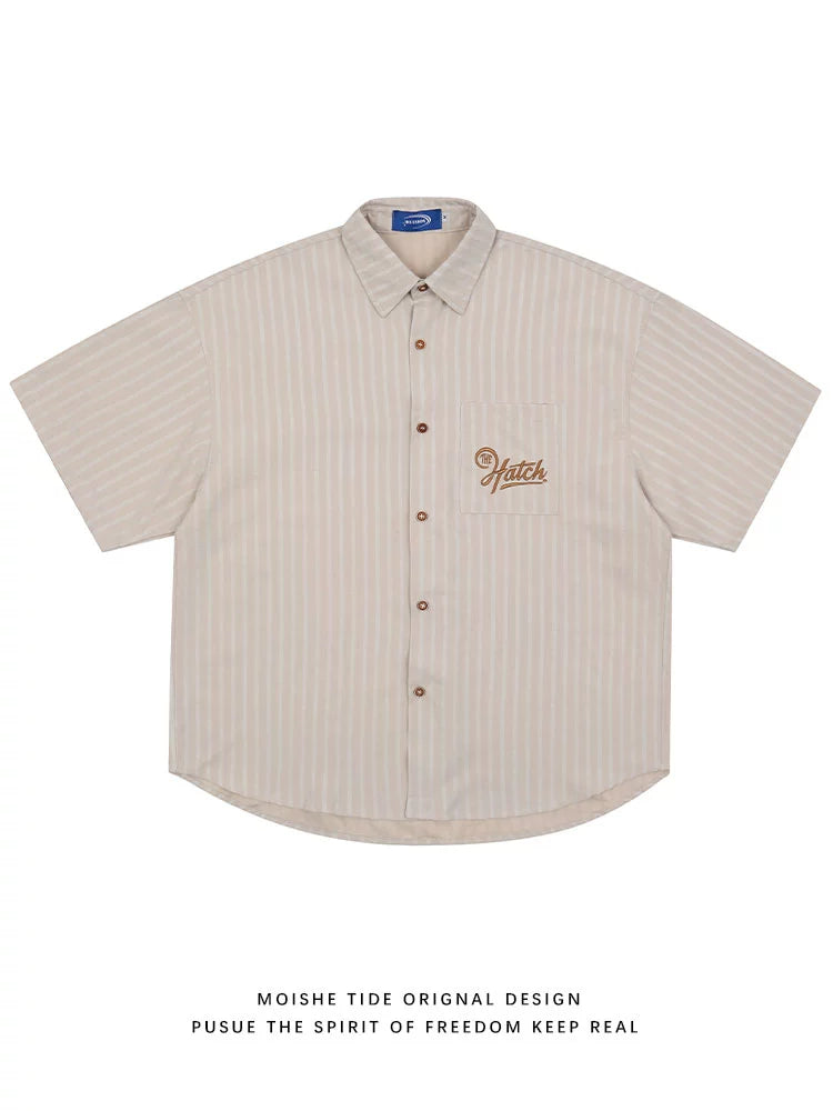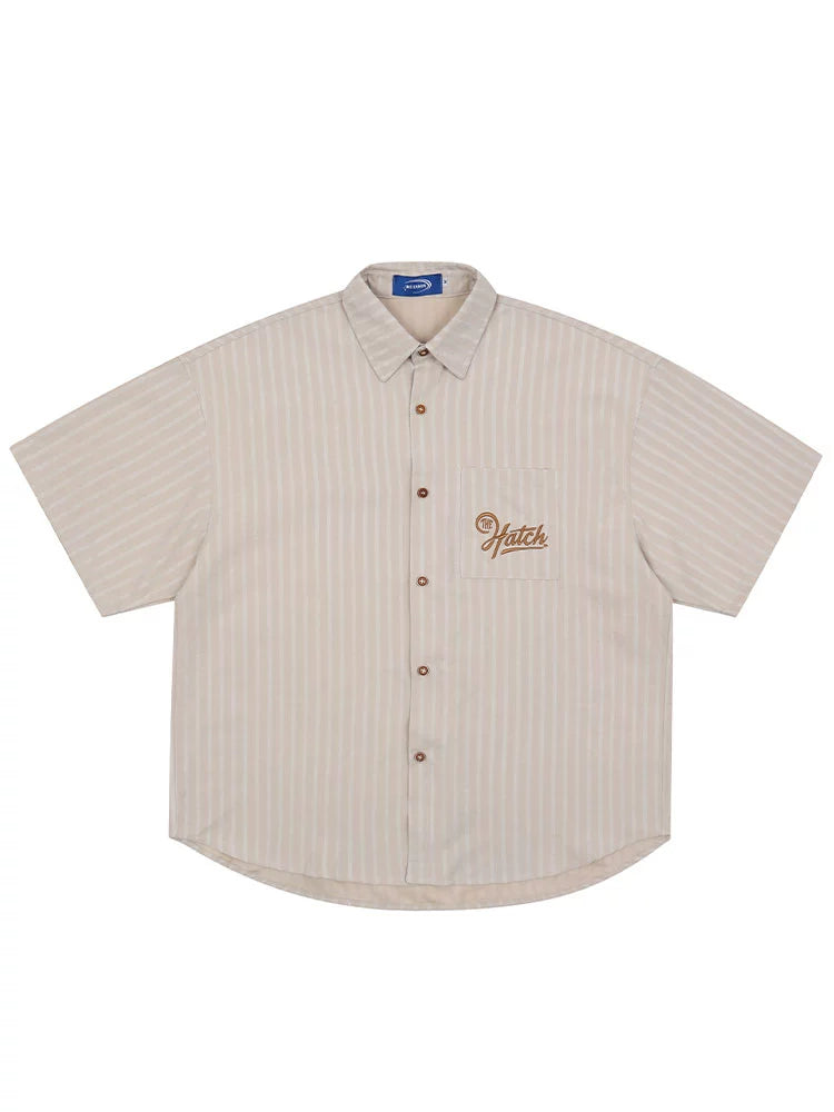 上品なストライプ柄に胸元の刺繍ロゴが映える、